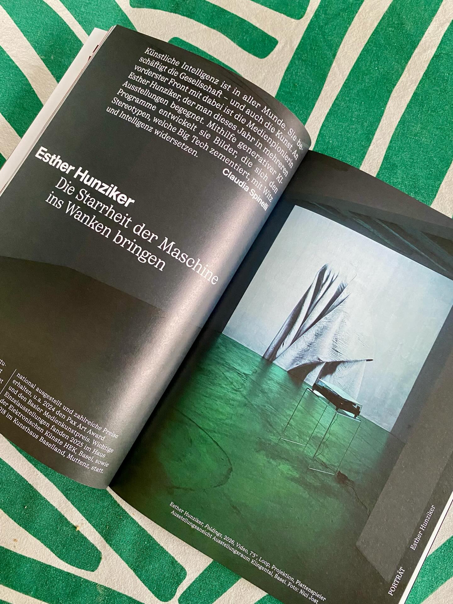 «Foldings» wird dieses Jahr wohl noch in weiteren Institutionen und Museen zu sehen sein: Die Ausstellungsagenda von Esther Hunziker ist voll. KI beschäftigt die Gesellschaft und – kaum verwunderlich – auch die Kunst. Einige Aufmerksamkeit erhielt letzthin der türkisch-amerikanische Künstler Refik Anadol. Seine Werke – morphende Strukturen, die an Bildschirmschoner auf XXL Screens erinnern – waren in den vergangenen Monaten vielerorts zu sehen: Ein Kunsthype, so belanglos und glatt, dass er bald wieder vergessen ist. Ganz sicher keine Eintagsfliegen sind die Arbeiten der Basler Künstlerin Esther Hunziker. Sie hat eine dreissigjährige Praxis im Bereich der Medienkunst im Rucksack und arbeitet an einem Werk, das mit Scharfsinn und Sorgfalt jene Randbereiche der medialen Wirklichkeit umkreist, in denen – so ihre eigenen Worte – «die Starrheit der Maschine ins Wanken gerät, bis etwas Rohes, fast Menschliches zum Vorschein kommt».